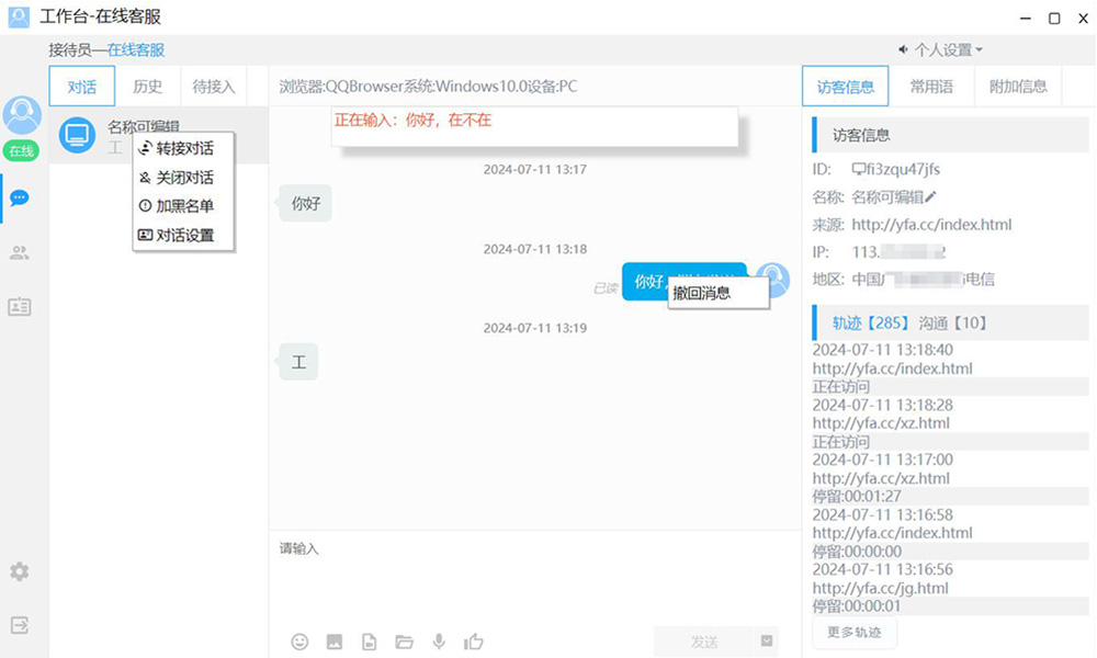 客服转接、历史消息查看、数据统计、来源追踪、问候语、访客等...